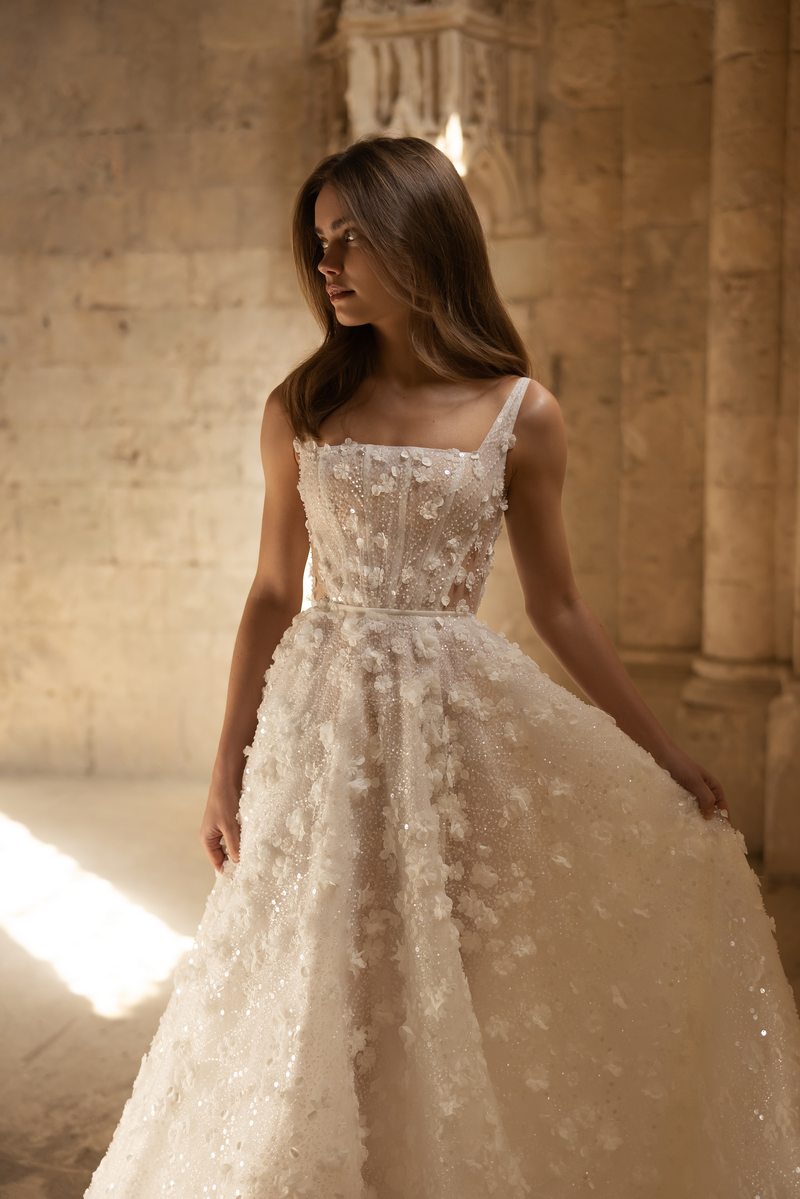 Upgrade your bridal style with this enchanting A‑line wedding dress from the Love Spell Collection. Crafted from intricate 3D floral lace, it exudes grace and romance. The square neckline and the shading on the skirt add subtle notes of modern elegance and charm, while the dreamy long train brings grace to every step.