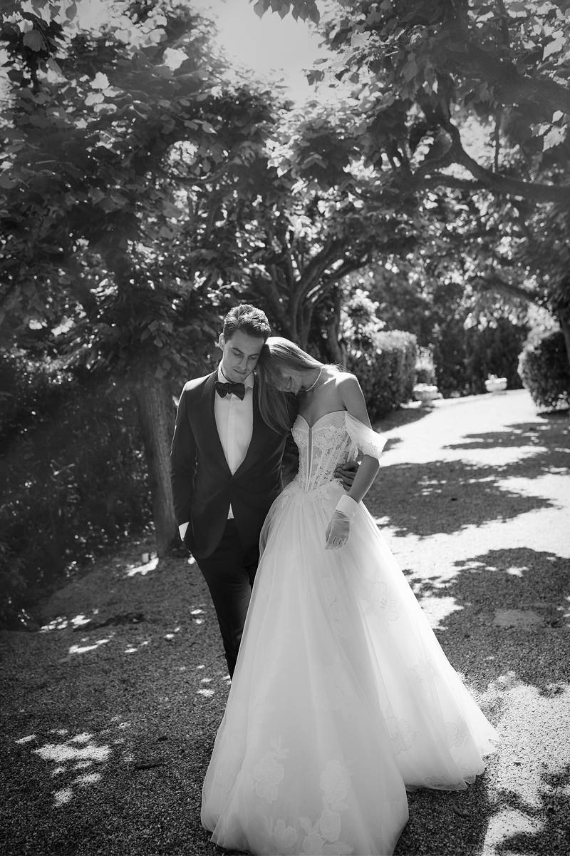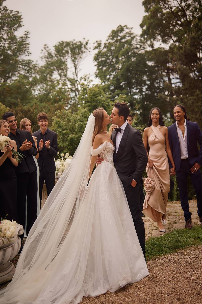 AMOR: Dress with a sweetheart off‑‑the‑shoulder neckline, featuring handcrafted floral embroidery on the corset, off‑‑shoulder sleeves, and an A‑line skirt with a sheer voluminous tulle overlay and draping detail on the left side.