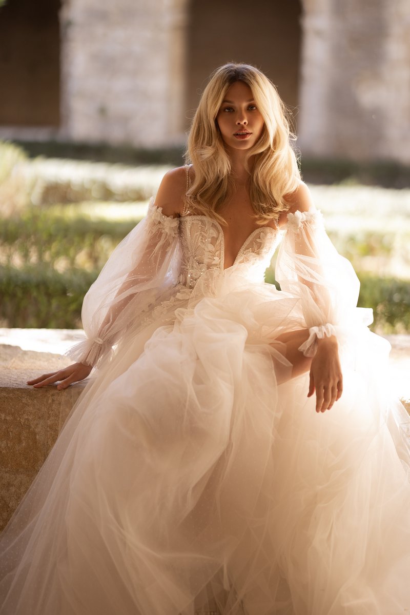 This enchanting tulle A‑line wedding gown from the Love Spell Collection is defined by its romantic allure. The bodice is adorned with delicate floral lace, and the sweetheart neckline with a deep cut adds both elegance and femininity.