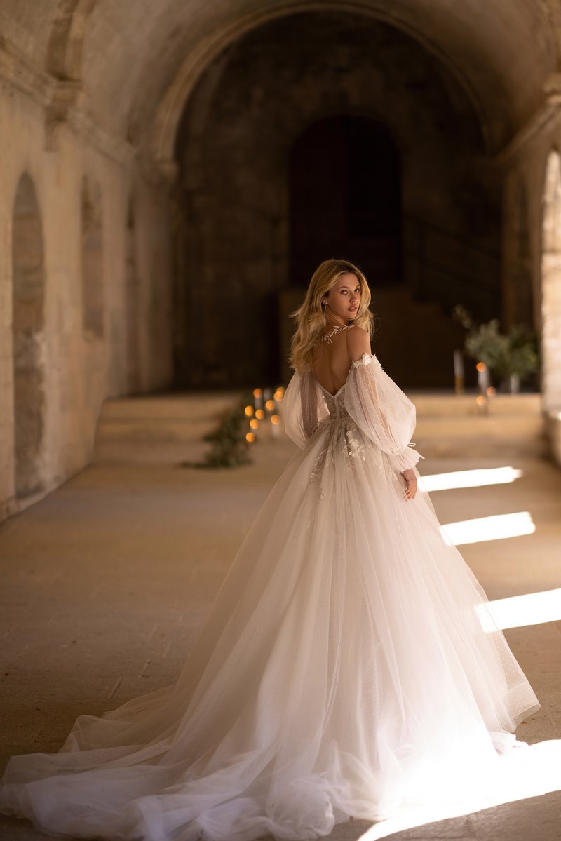It includes detachable puffed sleeves, allowing you to personalize your look and bring a touch of charm. Walk with confidence as the A‑line silhouette flows beautifully, creating a flawless image. This gown is a true statement of timeless beauty.